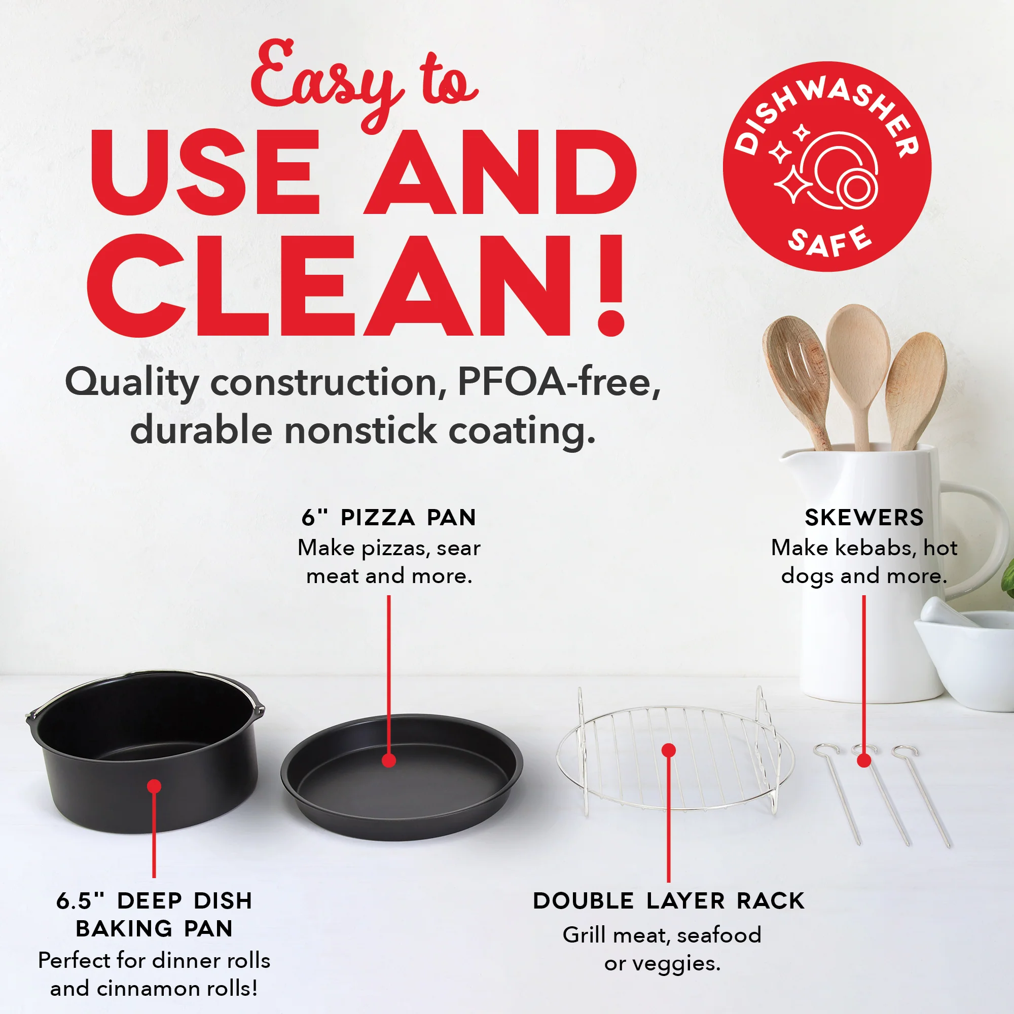 Expand your air frying menu with these PTFE nonstick accessories for your Dash 3QT Air Fryer! Make pizzas, quiches, kebabs, and more with two non-stick trays and a cooking rack with three skewers.