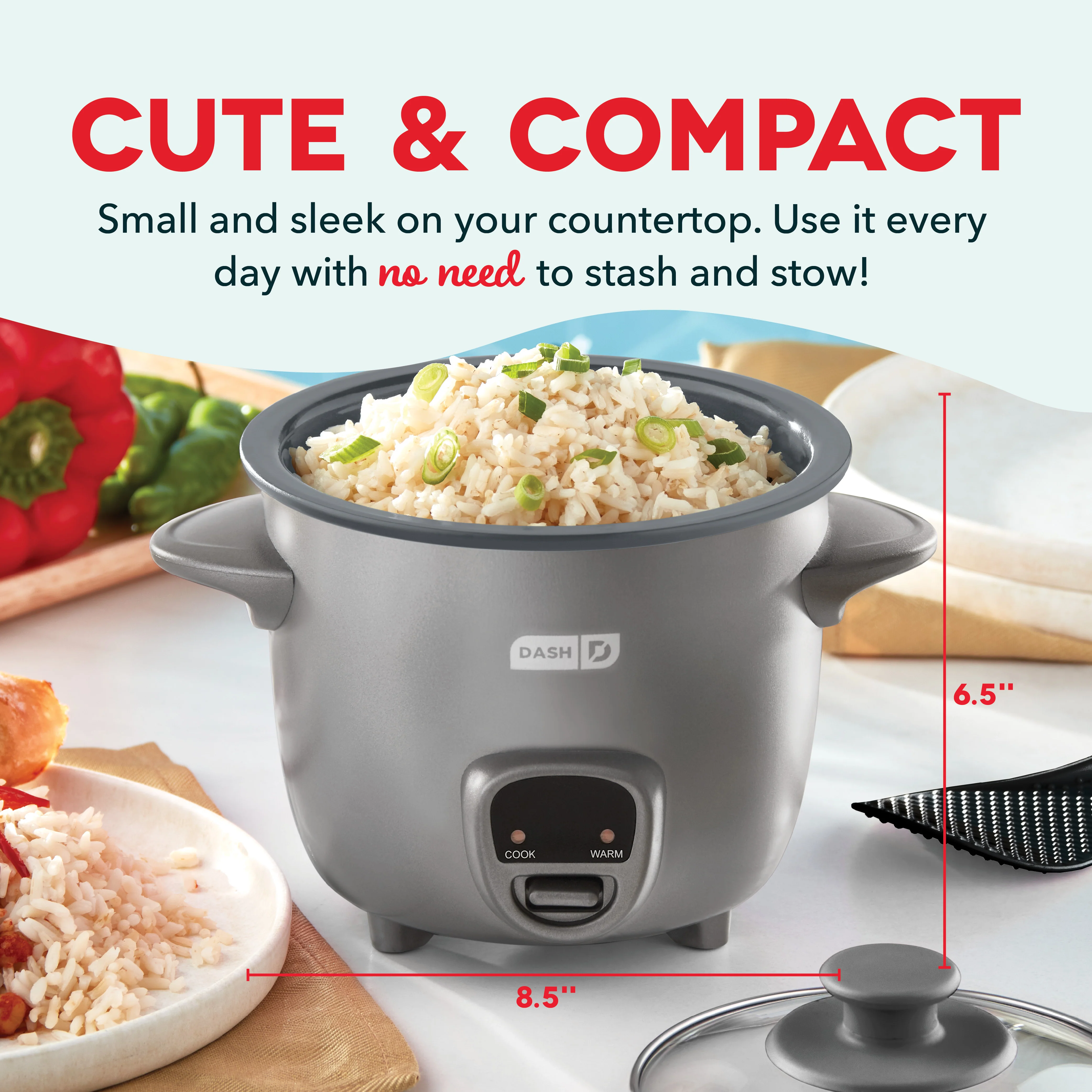 - Includes: Dash Everyday Rice Cooker, Rice Paddle, Measuring Cup, Removable Pot, and Glass Lid, and Recipe Guide
